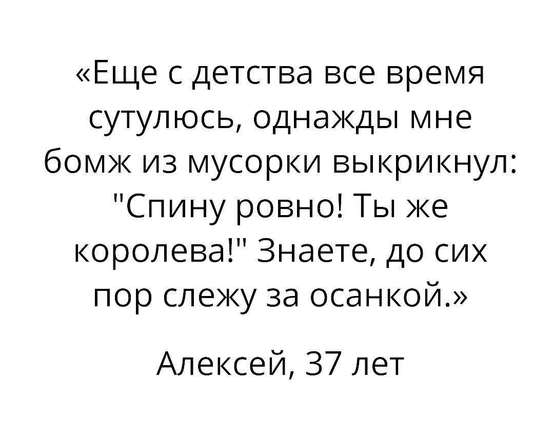 Сутулилась я с детства. Потом, уже во взрослом возрасте, несколько массажистов сообщили мне, что у меня небольшой сколиоз, кифоз и лордоз (всё в лайт-версии, но блин!). В подростковом возрасте никто моей сутулостью сильно не озаботился и врачам меня не показывали (а надо было бы, исправили бы сразу, и было бы мне счастье 😂). Единственное, что делали все без исключения мои родственники, это говорили «Алёна, не сутулься!» и почему-то всегда (все!) добавляли: «Зачем ты стесняешься своего роста? У тебя прекрасный высокий рост!»