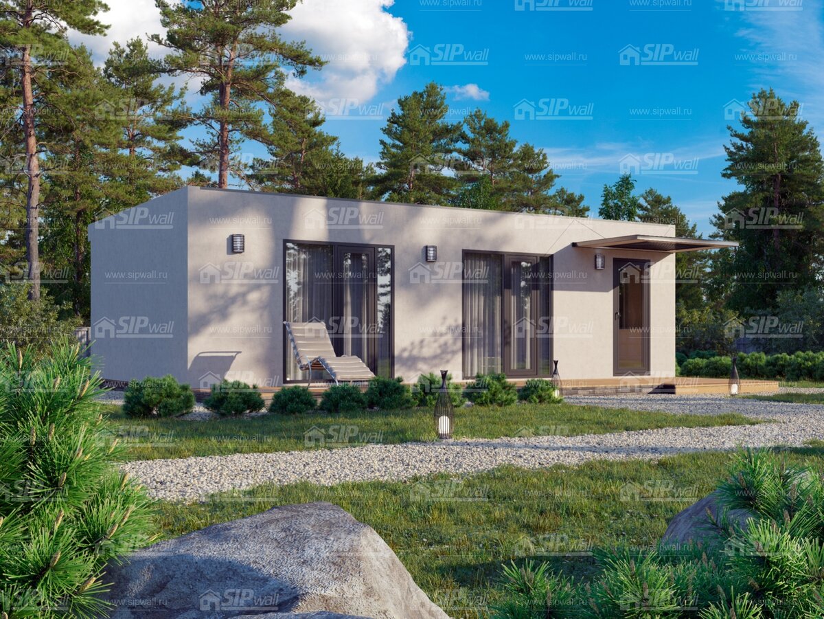 Мистик С -ультрасовременный небольшой дом для семьи из 3-4 человек. Стильный снаружи и уютный внутри, дом по проекту Мистик не оставит равнодушными ни Вас, ни Ваших соседей! При относительной компактности, в доме идеальная планировка, грамотное использование каждого м2 площади. При входе в дом – попадаем в коридор, из которого можно попасть в санузел и кухню-гостиную. Из гостиной можно попасть в две спальные комнаты. Веранда в доме совмещена с крыльцом. Общая площадь: 68.36 м2