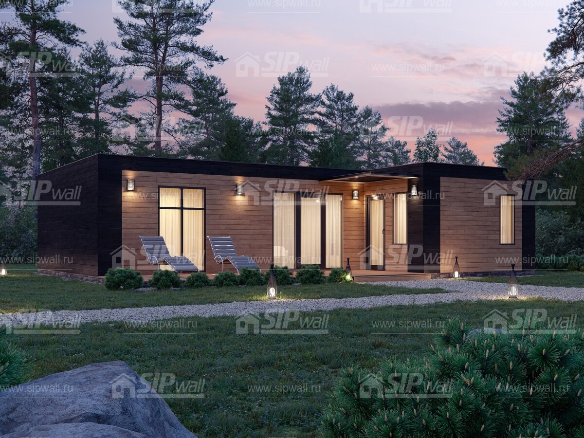 Очень стильный одноэтажный дом в стиле хай-тек с грамотно продуманной планировкой, обеспечивающей целесообразное использование каждого м2 площади дома. Просторная веранда является неотъемлемым плюсом этого проекта. Архитектурное решение с панорамными окнами не только придает образу дома стиль, но также создает внутри дома светлое и уютное пространство. Фасад дома, выполненный в контрастных цветах, придает дому изысканную лаконичность. В доме расположены три спальные комнаты, санузел, техническое помещение. Центральная часть дома отведена под просторную общую зону кухни-гостиной. Выход на крыльцо объединен с уютной террасой, где семья сможет отдохнуть и насладиться видом на прекрасный сад. Общая площадь: 101.88 м2