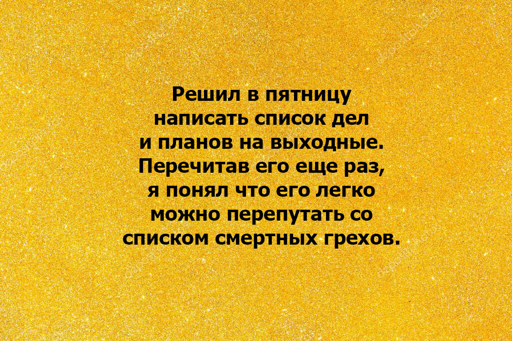 - Кум, может давайте по бутылочке пива выпьем? - Знаю я тебя. Давай сначала определимся сколько одна бутылочка литров пива в себе содержит, и нет ли в этом пиве еще чего покрепче… **** Британские ученые проводили исследование и выяснили, что девушки с лишним весом намного счастливые и более долго живут чем те мужчины, которые постоянно упрекают их в этом. **** Решил в пятницу написать список дел и планов на выходные. Перечитав его еще раз, я понял что его легко можно перепутать со списком смертных грехов. **** Наибольшая вера в магию и чудеса появляется в тот момент, когда человек ожидает зарплату, а тут ему приходит какое-то смс. **** Объявление: Соседи, внимание! Сбежал мой пёс, кто его найдет, просьба вернуть ошейник за 100 долларов. Собаку можете оставить себе. **** Звоню мужу: - Любимый, скажи, ты меня любишь? - Что ты сделала с моей машиной? - Машину я твою совсем не брала. - хух, ну тогда покупай! Вот что такое взаимопонимание в семье… **** Вот если бы я был блогером и снимал
