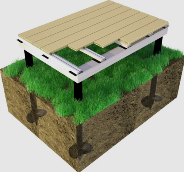 - вкрутите сваи (в их верхней части есть специальные «уши», в них вставьте трубы, они выполнят роль рычагов);