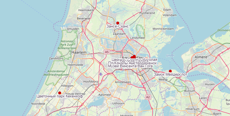 Что посмотреть и куда сходить в Амстердаме? Самые интересные и красивые места для прогулок. Карта, фотографии и краткое описание. 1. Цветочный парк Кекенхоф Кекенхоф (кухонный парк) - королевский парк цветов между Амстердамом и Гаагой в небольшом городке Лиссе, также известен как Сад Европы. Лучшее время для посещения с 20-х чисел марта до 20-х чисел мая. 2. Рейксмюзеум Рейксмузей - художественный музей в Амстердаме (Нидерланды). Входит в первую двадцатку самых посещаемых художественных музеев мира. Изначально располагался в королевском дворце, позже переведен в современное здание. Открыт для публичного посещения с 1885 году 3. Замок Мёйдерслот Мёйдерслот - средневековый замок Нидерландах. Расположен в Мёйдене, в 15 км от Амстердама. Замок расположен в 15 км от Амстердама, в устье реки Вехт, которая использовалась как транспортная артерия до города Утрехта. Сейчас в замке располагается филиалом Государственного музея Амстердама. 4. Королевский дворец Кор