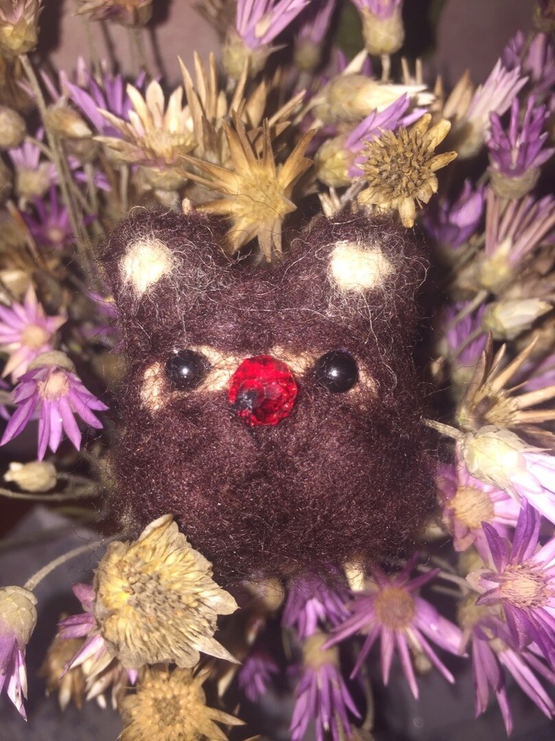 Всем здравствуйте! Хочу поделиться с вами своей первой работой из шерсти. Брошь выполнена в технике сухого валяния, глаза и носик - бусины. Для работы вам понадобиться: С помощью шерсти и иглы сваливаем форму будущей броши. Губка нужна для того чтоб сваливать форму. Положите кусочек шерсти на губку и с помощью иглы сваляйте нужную вам форму. Пришейте глазки и носик. Мягкий пластик нужен для каркаса. Вырежьте пластик такой же формой как ваша брошь, обшейте тканью. Если у Вас есть горячий клей, то приклейте к форме булавку для броши, затем приклейте форму к броши. Если горячего клея нет, тогда аккуратно приклейте.