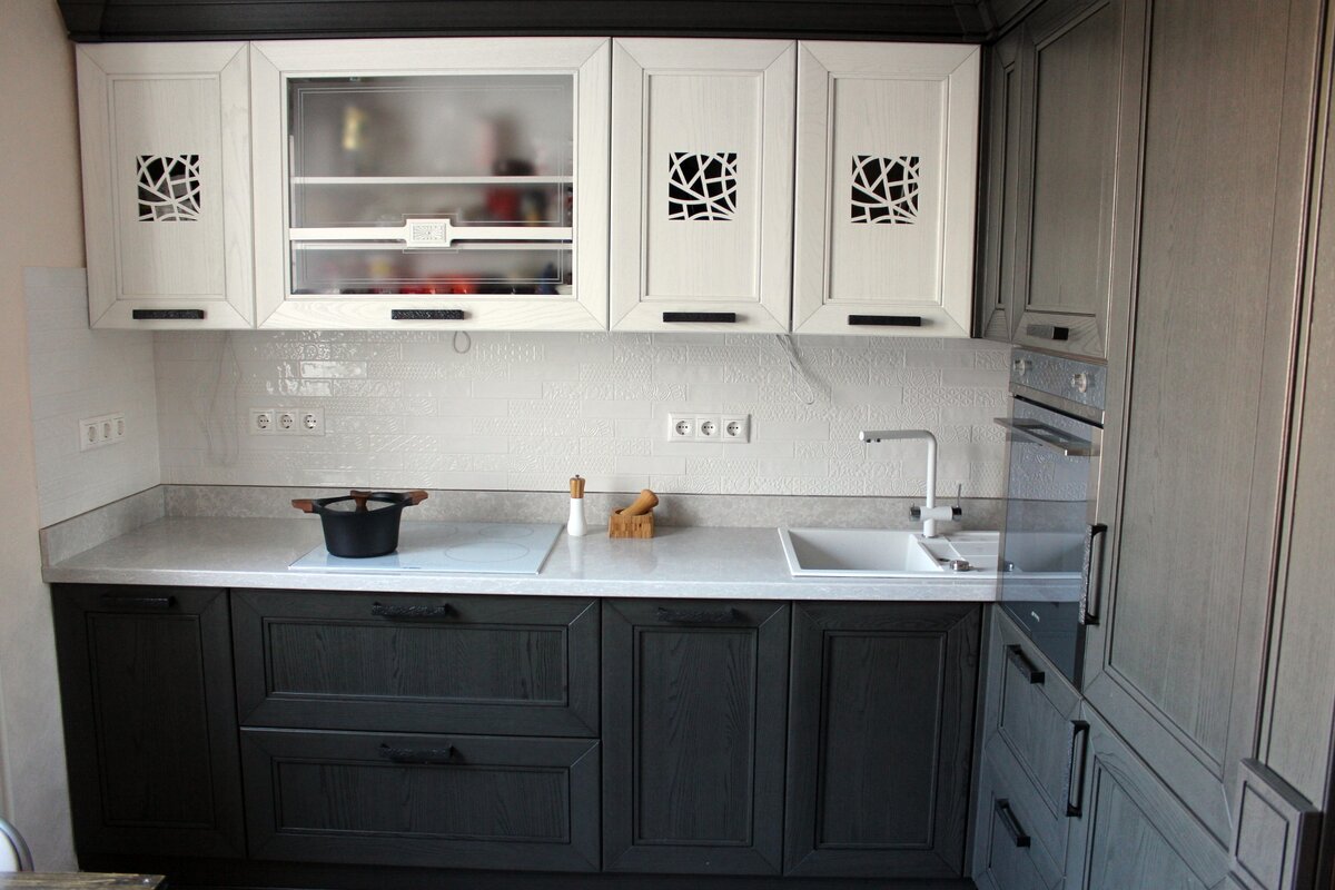 Угловое исполнение этой кухни даже не сразу обращает на себя внимание. Взгляд изначально оказывается прикованным к контрастному сочетанию белых и графитовых фасадов над рабочей зоной.
