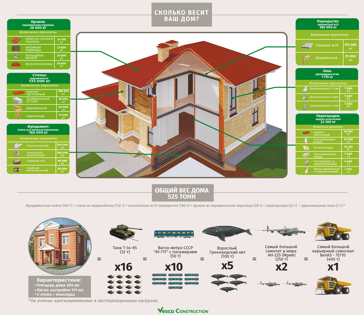 Для тех, кто собирается строить загородный дом, самыми важными характеристиками являются прочность, надежность и долговечность конструкции здания. Поэтому первый вопрос будущего домовладельца – из чего строить дом. Рассмотрим характеристику веса дома, как определяющего критерия основательности и долговечности жилого строения. В числе прочих расчетов, этот показатель обязательно высчитывается специалистами на этапе проектирования будущего дома. Без этого невозможно выбрать тип фундамента и определить его опорную площадь. Кроме того, суммарный вес дома с учетом веса фундамента является определяющим показателем для геологических изысканий – важно, чтобы несущая способность грунта соответствовала постоянным и временным нагрузкам здания. Отталкиваясь от этих характеристик, профессиональные проектировщики делают точные расчеты количества необходимых строительных материалов и составляют смету строительства. Тогда заказчик может принять решение – из какого материала строить дом
