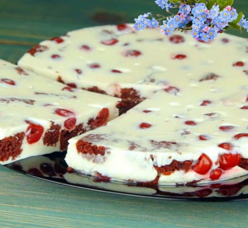 Приготовьтесь к чему-то потрясающему, этот рецепт сразит Вас наповал своей изысканностью и простотой. Это вкуснейший торт,который достоин того, чтобы стать вашим фирменным десертом. Беспроигрышное сочетание вишни и шоколадного бисквита. Ингредиенты: Приготовление: Готовим тесто для бисквита. Взбейте яйцо и сахар в пышную массу. Добавьте подсолнечное масло и сметану. Снова взбейте. Смешайте муку с какао и разрыхлителем, а потом медленно добавляйте по частям к жидкой смеси, постоянно помешивая до получения однородной массы. Смажьте форму и выложите на нее тесто так, чтобы его толщина не превышала 3 см. Поставьте форму в разогретую до 190 градусов духовку и выпекайте бисквит 15–20 минут. Дайте остыть готовому бисквиту. Замочите желатин в воде и оставьте его на 15–20 минут. Готовим крем. Протрите творог через сито и добавьте в него сливки, сахарную пудру и ванилин. Хорошенько взбейте, лучше сделать это миксером. Растопите разбухший желатин на водяной бане и добавьте его в крем