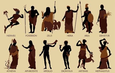 Главными богами в Древней Элладе признавалось те, что относились к младшему поколению небожителей. Некогда оно отняло власть над миром у старшего поколения, олицетворявшего основные вселенские силы и стихии (см. об этом в статье Происхождение богов Древней Греции). Богов старшего поколения обычно именуют титанами. Победив титанов, младшие боги во главе с Зевсом поселились на горе Олимпе. Древние греки чтили 12 олимпийских богов. В их список обычно включались Зевс, Гера, Афина, Гефест, Аполлон, Артемида, Посейдон, Арес, Афродита, Деметра, Гермес, Гестия. К богам-олимпийцам близок и Аид, но он живёт не на Олимпе, а в своём подземном царстве. Зевс – главное божество древнегреческой мифологии, царь всех других богов, олицетворение беспредельного неба, повелитель молний. В римской религии ему соответствовал Юпитер. Посейдон – бог морей, у древних греков – второе божество по значению после Зевса. Как олицетворение изменчивой и бурной водной стихии Посейдон был тесно связан с зе