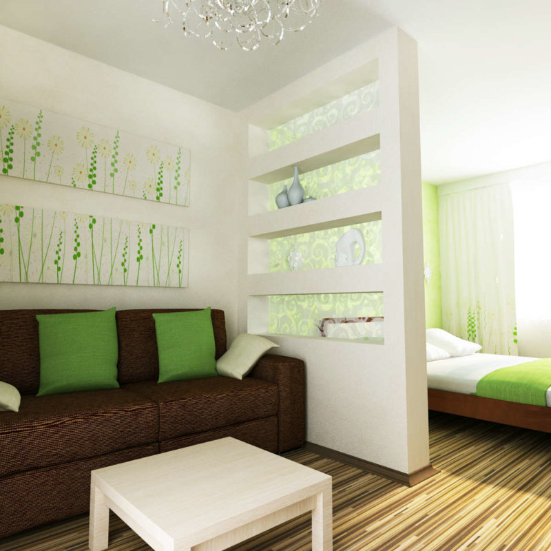 1. ПЕРЕГОРОДКИ. Это облегченная альтернатива межкомнатной стены. Их делают из гипсокартона, бетона, пластика, дерева, стекла и других материалов. Фактически, посреди комнаты достраивается отдельная стена. так же можно использовать различные стеллажи, шкафы, декоративные конструкции,полки и прочую мебель. 2. ПОДИУМ. У использования подиумов для зонирования квартиры есть два основных преимущества: - Они не «съедают» место, в отличие от стен, перегородок и других сплошных конструкций. - Возвышение отлично подходит для хранения вещей вместо шкафа. В подиум прячутся не только коробки, одежду или постельное белье, но даже и выдвижная кровать. А на маленьких подиумах можно попробовать устроить зеленый уголок или рабочую зону.
