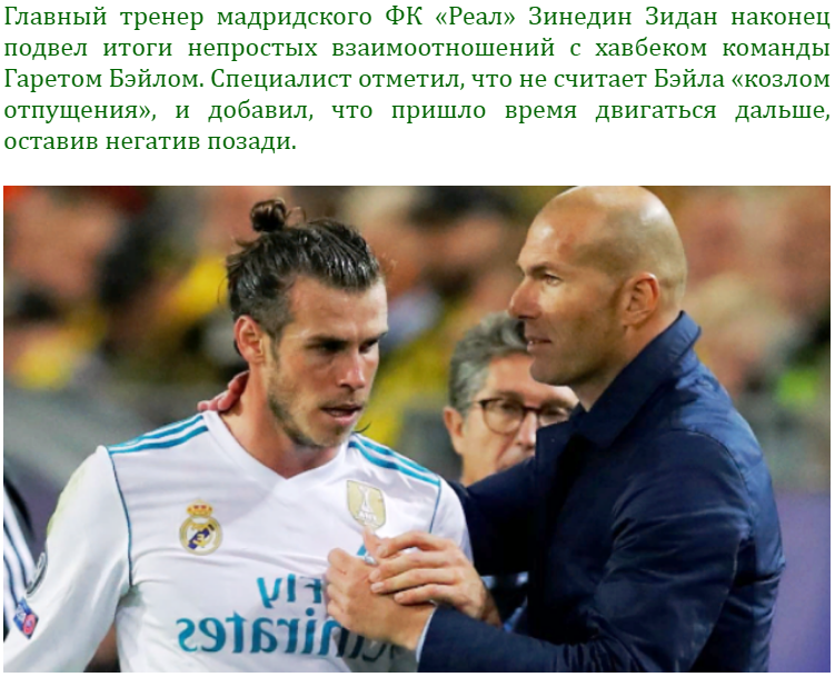 Новостной Терминал Зидан наконец подвел итоги по ситуации с Гаретом Бэйлом, с которым некоторое время у него не ладились отношения. Сейчас специалист резюмировал, что виноваты в этой истории все стороны, ведь они одна команда, а также добавил, что сейчас все счастливы, а потому настало время двигаться дальше. В прошедшее летнее трансферное окно «Реал» хотел продать Бэйла, а сам хавбек говорил, что несчастлив в мадридском ФК. Подробнее по теме в источнике Новостной Терминал.