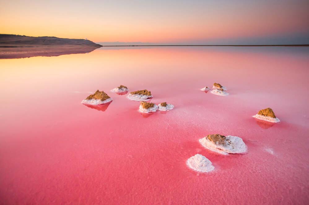 Все зависит от того, где вы живете и где уже побывали. Живущий в Сыктывкаре хочет на юг, а тот кто живет на Кубани на восток. Москвичи хотят побывать везде...))). Могу высказать свое мнение, не стоит ехать за 3/9 земель, если рядом есть такая красота: Это Кояшское озеро, в паре десятков километров от Керчи, Крым. Ну как вам, красиво? Я был там, но в тот момент озеро почти высохло (сезонно, временно летом). Были маленькие водные фрагменты где чуток глубже, а в основном соль. Соль бледно-розового цвета. Красота! Справедливости ради скажу, что озеро было почти белое, т.к. уже высохло, но розовый цвет тоже присутствовал и, хоть, не так выражено, но все равно очень красиво. Ступать голыми ногами приходилось осторожно, медленно и не долго, вообще не рекомендую, можно порезаться, так как кристаллы очень острые, запаситесь резиновыми шлепками, обычная обувь рискует испортиться. Кристаллы соли очень красивые, но нужно учесть они хрупкие. Дышать на озере необычайно легко, я думаю и полезно.