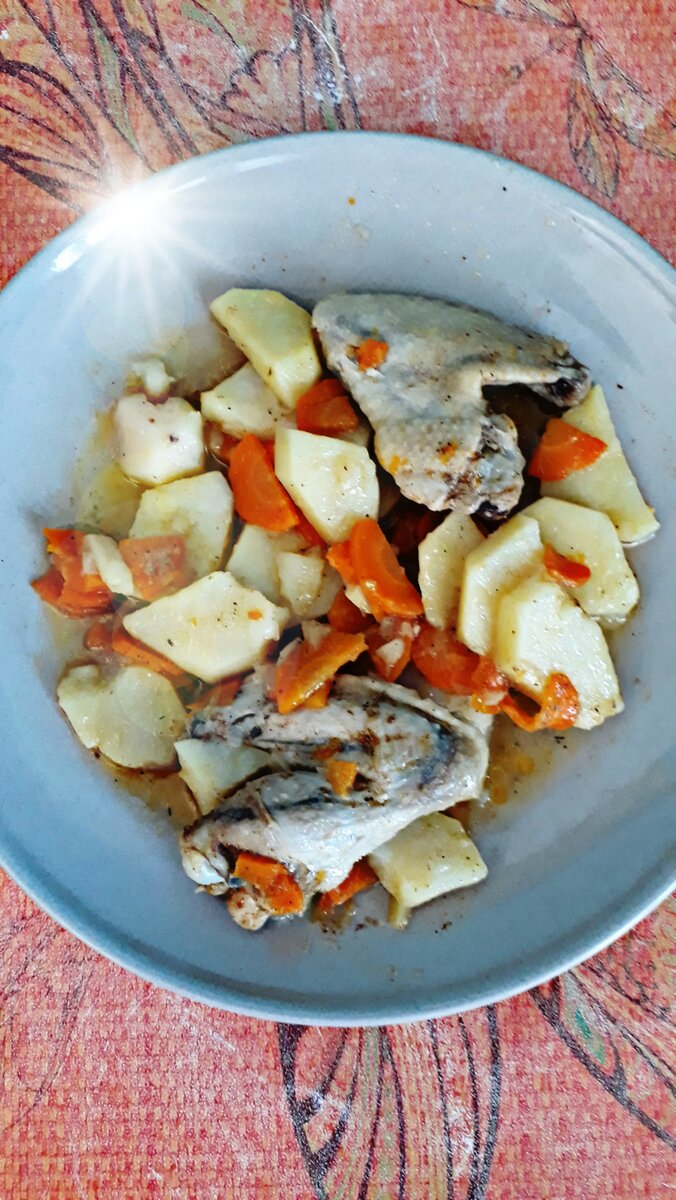Ингредиенты: 8 - 10 куриных крыльев, 8 картофелин, 2 луковицы, 1 морковь, соевый соус, 3 ст.ложки майонеза или сметаны, приправа для курицы, растительное масло. Приготовление: Соевый соус смешать с майонезом или сметаной, добавить к ним приправу, тщательно смешать все вместе и замариновать в них крылья. В сотейнике или глубокой сковороде разогреть растительное масло. Выложить в него мелко нарезанный лук и морковь, нарезанную соломкой или кружочками. Поджарить их до мягкости и золотистого цвета. Добавить к ним картофель, нарезанный кружками, перемешать и еще немного обжарить все вместе. Уложить поверх картофеля крылья, залить стаканом горячей воды, накрыть крышкой и тушить до готовности на среднем огне 40 - 50 минут.
