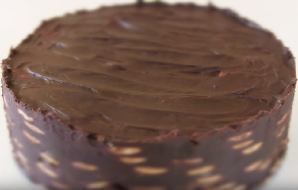 Доброго времени суток! Уважаемый читатель моего сайта. Сегодня я; Вам расскажу, как приготовить торт Шоколадный из печенья и без выпечки простой рецепт. Для приготовления нам понадобится: Ингредиенты: 600 грамм печенья. 1 килограмм шоколадных чипсов (конфетки маленькие). 250 миллилитров молоко в шоколад. 200 миллилитров молока для печенья. 150 грамм сливочного масла. 1 чайная ложка растворимого кафе. Готовим торт. Доводим 250 миллилитров молока до кипения. Берём глубокую чашку, высыпаем шоколад и заливаем кипящим молоком, перемешиваем ложкой, чтобы растаял шоколад, добавляем мягкое сливочное масло или растопленное, перемешаем венчиком массу до однородного состояния. Берём глубокую чашку, выливаем 200 миллилитров горячего молока и растворяем кофе, перемешиваем. Берём форму диаметром 22-24 сантиметра и смазываем сливочным маслом. Берём печенье по одному макаем в молоко и выкладываем на дно формы в один слой, чтобы дна видно не было, смазываем шоколадом и снова слой печенья