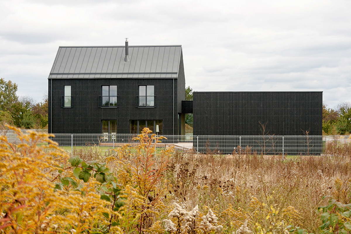 Архитектурная композиция этого дома образует внутренний сад и изолирует его от улицы. Проект состоит из трёх отдельных блоков: главного двухэтажного дома с острой крышей, одноэтажной кухни-столовой и гаража с сауной. Такая разбивка позволила обеспечить требуемые площади и, в то же время, вписаться в окружающий масштаб без доминирования. Гостиная основного дома соединена со столовой стеклянным переходом; здесь же образован закрытый дворик для летней столовой. Все три блока объединены общей террасой. Архитектура выполнена в скандинавской стилистике, снаружи все строения отделаны выкрашенным в чёрный цвет деревом. Название: Шведский дом (Svedu House)