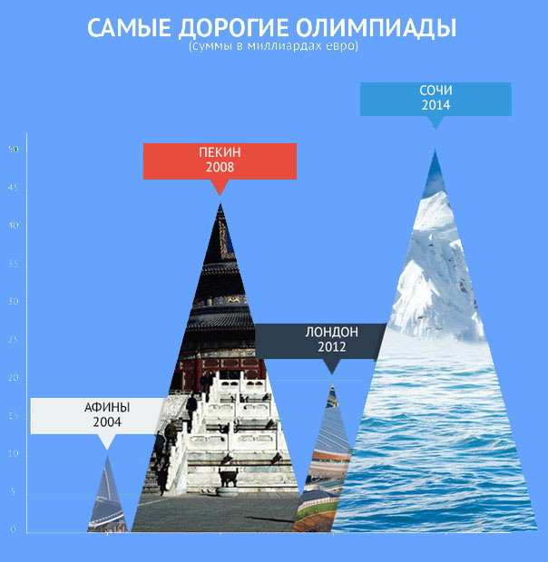 Так сложилось, что зимняя олимпиада в разы меньше летней, 15 видов против 41, однако эта олимпиада вошла в историю, как самая "дорогая олимпиада". Затраты на ее проведение, превысили 50 миллиардов долларов, внушительная сумма. Для сравнения, зимние олимпийские игры в Ванкувере "стояли" 8 миллиардов долларов. анные: Sports.ru