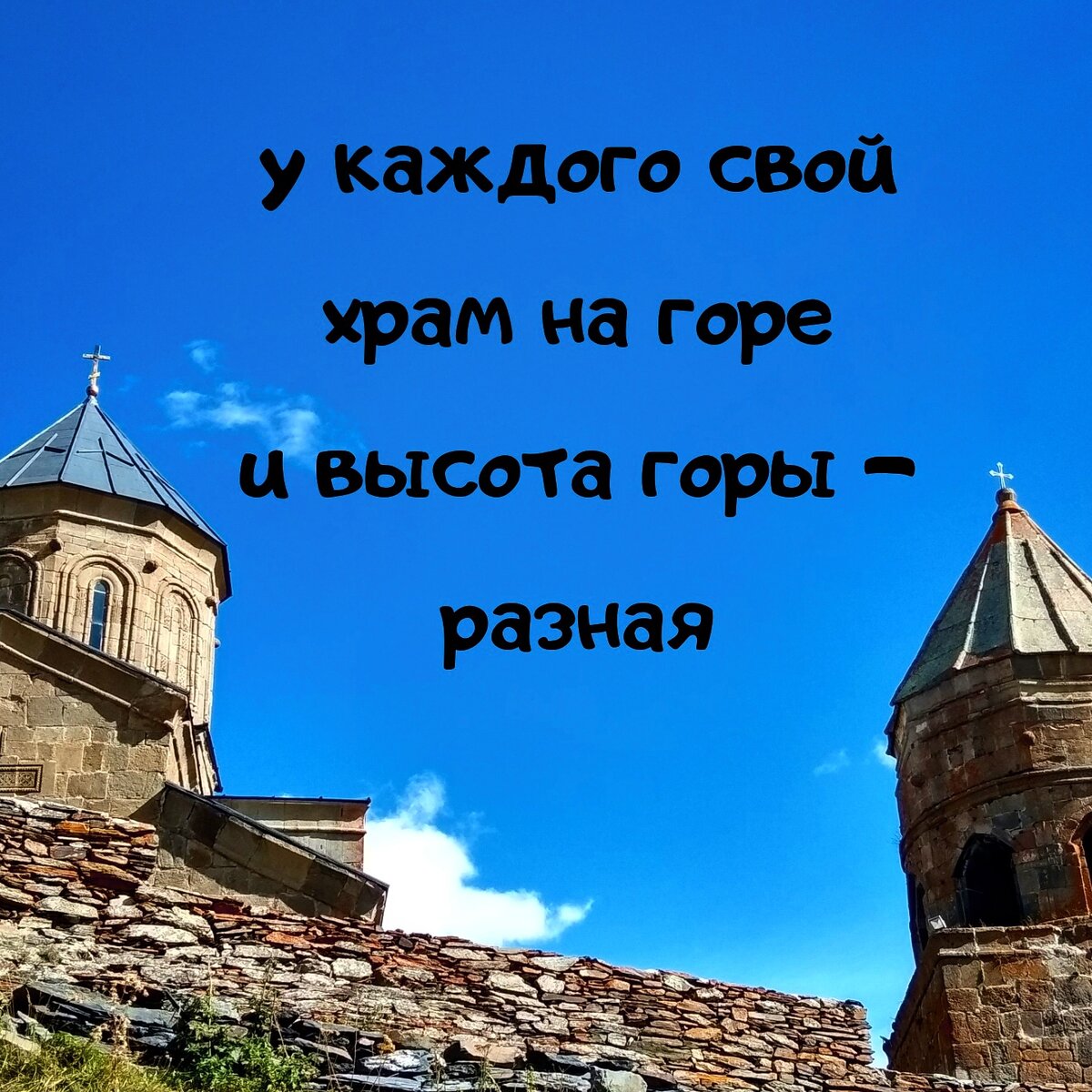 О, благословенная Грузия! Ты превзошла все ожидания…Недаром я два года мечтала о поездке туда. Страна, где все время дорогу в гору: по брусчатке, по камням, положенным ребром вверх, по тропинкам-ступеням…все время вверх, вверх, вверх…Почему-то не помниться схождение вниз)) Удивляешься выносливости этого гордого, но не горделивого народа: когда сама природа проверяет людей на прочность ног и плеча соседа…Когда селения так расположены, что приходится на соседнюю улицу перебираться через горную речку, вверх на холм и еще наискосок от скалы…И как не быть дружным с соседом, когда НИКАКАЯ машина не доедет к твоему дому, расположенному так высоко от дороги… О, это бескрайняя, высокая синева неба, с облаками, целующими горы… Несравненный легкий воздух и аромат Грузии, нередко расцвеченный запахом специй… Ливень – вдруг, на 10 минут… Сохнущее белье - на балконах, террасах, среди винограда, вдоль пешеходных улиц… Быт – очень простой, неприхотливый до небрежности, такой по-родному уютный