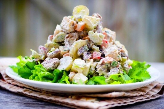 - майонез, листовой салат, лаврушка, перец, соль. Приготовление: 1. Сначала язык отваривают в соленой воде, очищают от кожицы, режут небольшими кубиками. Яйца отваривают, режут вместе с огурцами аналогичным образом.