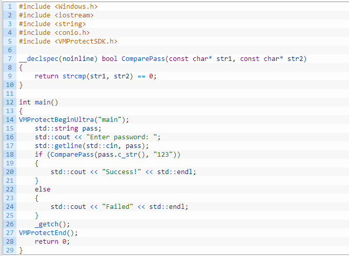 3) Какой протектор выбрать для защиты своего ПО. Начнём с первого пункта, предположим мы сделали мини-крякми со следующим кодом: Мы защитили функцию виртуализацией через маркеры, и, казалось бы, теперь код безопасен от лёгкого патча. Это так, но лишь от части. Не стоит забывать что протекторы виртуализовывают лишь ту функцию или её часть, которую вы отметили маркерами. То есть под защиту попадут лишь те инструкции, которые находятся в функции main, код функций, которые вызываются внутри маркеров, затронут не будет.