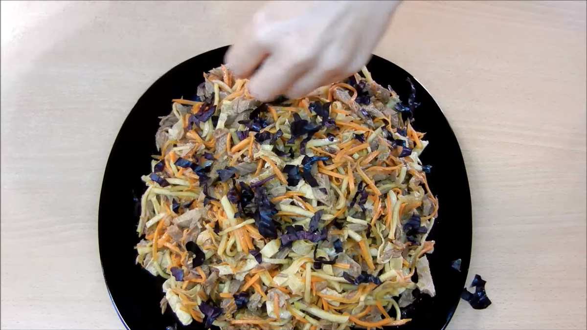 Всем привет Вы на канале " О Еде, просто и со вкусом". Сегодня я поделюсь с вами рецептом приготовления очень вкусного и интересного мясного салата - Загадка. Для приготовления вам понадобится: Зелёную редьку нужно нарезать тонкой соломкой или же как вариант потереть на корейской терке. Редьку нужно посолить и оставить так для того чтобы она пустила сок. Одну луковицу нарезаем полукольцами а морковку натрите на тёрке для корейской моркови. Ещё нам понадобится два яйца, добавьте сюда щепотку соли и две столовые ложки воды. Всё перемешайте и жарьте из этой смеси блинчики. Сковороду слегка смажьте растительным маслом. Наливаем слегка яичной массы, чтобы блинчики получились тоненькими. Жарим блинчики с двух сторон. Жарятся блинчики просто мгновенно. Лук обжариваем на растительном масле до золотого цвета. В итоге у вас получится примерно четыре тоненьких блинчика. Их нужно остудить, свернуть рулетиком и порезать соломкой. Я готовлю салат с отварной телятиной, её можно