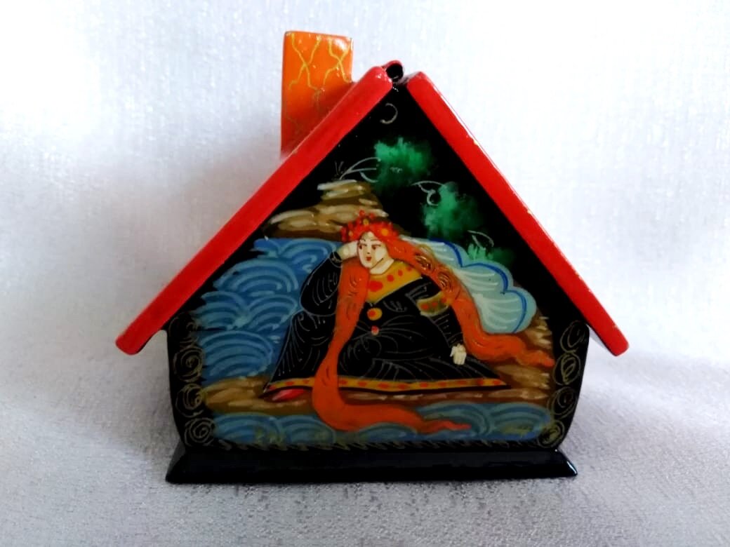 Была в отъезде, и поэтому не было возможности писать. А была я в командировке в г. Краснодар и привезла много новых знаний по работе, личных эмоций и, конечно же, впечатлений: от праздника города, от антикварных и сувенирных магазинов, от местных жителей и просто от смены обстановки. О магазинах напишу чуть попозже, а пока о покупках. И первое, о чем я расскажу, - шкатулка. Купила ее на подарок, поэтому она у меня совсем ненадолго. Как мне сказали, что это дерево, но я всё-таки склоняюсь, что это папье-маше. Небольшой домик с открывающейся крышей, который служит крышечкой этой шкатулки. Ширина по низу домика 6 см, а высота вместе с трубой - 6, 5 см. Все как в классической лаковой миниатюре - черный и красный лак. На передней и задней стенках домика-шкатулки картинки, точнее роспись. Роспись ручная, не очень высокого качества, но неплохая. На одной стороне стоит надпись, название сказки «С. Аленушка», и место производства - Мстера. Одна половинка крыши (там, где нет трубы) открывае