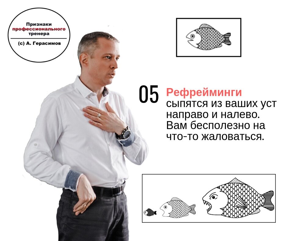 Когда некоторые ученики начинают привычно пытаться «слиться» с упражнений, демонстраций или обратной связи, традиционно прикрываясь своими страхами, профессиональный тренер, виртуозно демонстрируя искусство владения вербальным рефреймингом, вежливо и экологично «снимает» эмоциональное напряжение обучающегося, высвобождает его внутренние ресурсы, вселяет дополнительную уверенность и аккуратно возвращает его в учебный процесс в гораздо лучшем состоянии.
