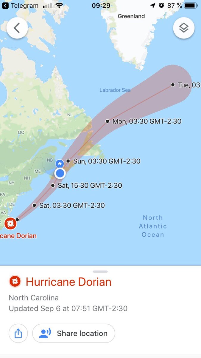 7 Сентября на Галифакс, столицу канадской провинции Новая Шотландия (Nova Scotia) обрушился ураган Дориан, который метеорологи оценивали сначала как ураган первой, затем второй категории. Скорость ветра достигала 170 км/час. Ураган успел наделать шуму на Багамских островах, затопив более 130 тысяч домов и оставив около полумиллиона человек без электричества. Погибло около пятидесяти человек. В 2003 году город пережил ураган Хуан, в результате которого погибло 8 человек, было разрушено множество домов и инфраструктурных объектов, без электричества остались более 300 000 человек, некоторые ожидали восстановления сетей 2 недели. Ущерб от Хуана составил более 300 миллионов долларов. Город еще хорошо помнит события шестнадцатилетней давности, поэтому к предупреждениям метеорологов о надвигающемся шторме относится крайне серьезно. В магазинах выстроились культурные очереди за не портящимися продуктами, на заправках автомобилисты наполняли баки своих машин топливом, большие очереди наблю