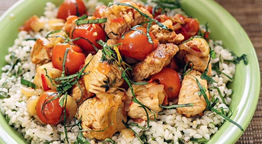 ИНГРЕДИЕНТЫ ПОШАГОВЫЙ РЕЦЕПТ ПРИГОТОВЛЕНИЯ Шаг 1 Разогрейте духовку до 190 °С. Нарежьте филе индейки крупными кубиками. Лук очистите и нарежьте полукольцами. Чеснок очистите и оставьте целым. Фасоль откиньте на дуршлаг и промойте. У перца чили удалите семена, мелко порубите. Шаг 2 Крупные помидоры залейте кипятком на 2 мин., затем обдайте холодной водой и снимите кожицу, нарежьте кубиками. Помидоры черри наколите в нескольких местах зубочисткой. Шаг 3 Нагрейте оливковое масло в широкой огнеупорной кастрюле на среднем огне и обжарьте лук до мягкости, переложите на тарелку. Поместите в кастрюлю индейку и жарьте до румяной корочки со всех сторон. Шаг 4 Верните в кастрюлю лук, влейте бульон и добавьте нарезанные помидоры, тимьян, чеснок, перец чили и фасоль. Доведите до кипения, положите помидоры черри, накройте крышкой и поставьте в духовку на 30 мин. Снимите крышку и оставьте еще на 10 мин., чтобы соус немного уварился. Шаг 5 Пока тушится индейка, промойте рис до прозрачной воды. Мелко н