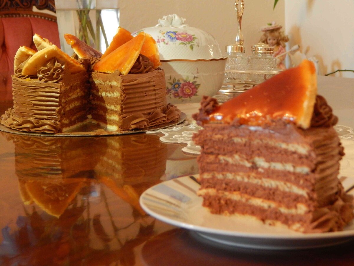 Смазанным растительным или сливочным маслом ножом разрезать карамельный корж на 12 или 16 клинышков. Как только карамель полностью подсохнет, красиво уложить клинья на верх торта – как символ клиньев, которые разбивают сердца.