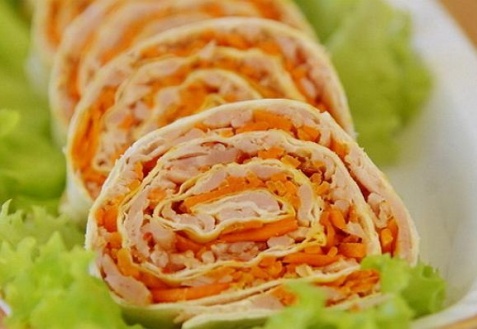 На мясо выложить немного чеснока и сыра. Сверху – 2 пластины бекона, затем брусочки моркови и стручки фасоли.