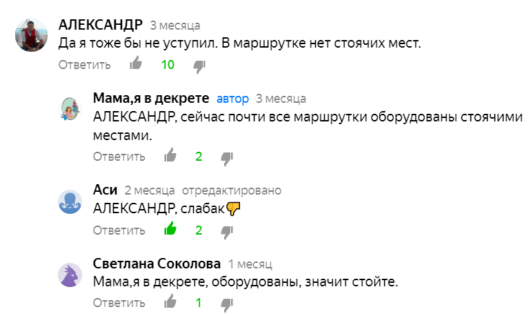 На моём канале собралось много комментариев от мужчин, что сейчас равноправие и нечего друг от друга что-то требовать. Например, я писала про ситуацию с маршруткой. Что никто не хотел уступать мне место с ребёнком. Все же такие уставшие с утра едут на работу. Проснулись, а уже устали, что ноги не держат. Или вот ещё один комментарий от представителя мужского пола: Мужчины требуют, чтобы мы были с ними наравне. И мы уже с ними на равных занимаем высокие должности, работаем на тяжёлых работах, таскаем тяжести, принимаем решение и т.д. Тогда и вы, дорогие, не забудьте взять часть женских обязанностей на свои плечи. Для начала, по приходу домой, забудьте о диване и телевизоре. Сходите в магазин, купите продукты, сварите борщ, накормите детей, уберитесь дома, уложите детей спать. А потом можете посвятить время себе любимому. И при разводе дети будут оставаться с вами. Вы их зачали, вы их и воспитывайте. По статистике, больше всего разводов происходит в первый год жизни ребёнка. Значит, мат