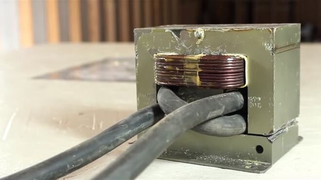 Для начала вам нужно достать из микроволновой печи трансформатор потом надо будет снять Вторичную обмотку из-за ее ненадобности вам придется демонтировать, для чего уже пригодятся молоток и зубило. Очень важно при этом не повредить и не помять первичную обмотку, поэтому действовать надо с максимальной аккуратностью. Если при демонтаже вторичной обмотки вы обнаружите в трансформаторе шунты, используемые для ограничения силы тока, их тоже надо удалить. Потом в месте от куда вы выбили вторичную обмотку вам надо намотать новую, берём кабель 50 КВ и наматываем 1 виток после подключаем трансформатор в сеть и сварка готова . Вот схема