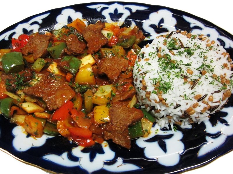 Промыть рис (здесь смесь риса) 3-4 раза в подсоленной воде. Затем сварить. Слить лишнюю воду и плотно закрыть крышкой, чтобы рис упрел. В другой посуде приготовить гарнир. Для этого пережарить лук в масле или курдючном жире. Мелко нарезать чеснок обвалять его в черном перце и тоже пережарить. После этого положить мелко нарезанное мясо, добавить помидоры или томат. Мелко нашинковать капусту и болгарский перец, картофель и морковь нарезать кубиками. Все положить в казан и продолжать варить. Доведя продукты до полуготовности посолить и добавить лавр лист и специи по вкусу налить воды и дать закипеть на медленном огне в течении 10-15 мин. В чашки положить готовый рис и залить гарниром. Перед подачей на стол присыпать любимой зеленью или перьями зеленного лука. Приятного аппетита! На 600г риса- 500г мяса, 200г жира или раст масла, 2 головки лука, головка чеснока, по 2-3 шт моркови, картофеля и помидоров, 1 редька(по желанию) 150 г капусты 1 болгарский перец, 1 пучок смешанной зелени дл