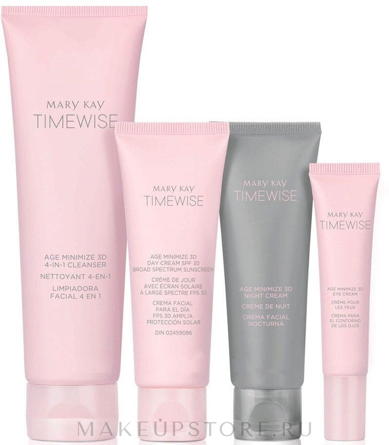 Система по уходу за кожей TimeWise® «Чудо-набор» Age Minimize 3D Чудо-набор TimeWise® «Чудо-набор» Age Minimize 3D от компании Mary Kay - создан для того, чтобы: - Защитить вашу кожу от негативного внешнего воздействия окружающей среды, - Защитить вашу кожу от ультрафиолетовых излучений. - Замедлить старение вашей кожи (рекомендовано применять с 25 лет). - Сохранить молодость вашей кожи (при использовании набора через несколько применений вам уже заметны значительные изменения). Система по уходу за кожей является настоящим прорывом по уходу за кожей от Mary Kay. Она обеспечивает полный антивозрастной уход за кожей вашего лица. При регулярном использовании этого набора вы будете замечать следующие изменения: - Заметное сокращение возрастных морщин на лице. - С вашего лица исчезнут мимические морщины. - Ваша кожа приобретет здоровое сияние и будет на ощупь гладкая и нежная. - Кожа станет более упругой (т.к. с возрастом кожа теряет свою упругость). - Заметно улучшится общее со