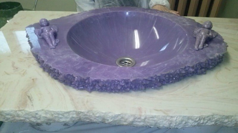 Данный материал успешно имитирует натуральный камень, при этом более доступный по цене. Жидкая форма позволяет отлить из него предметы любой формы. После застывания образует гладкую, бесшовную поверхность. Поэтому он так популярен при изготовлении столешниц для кухонь.