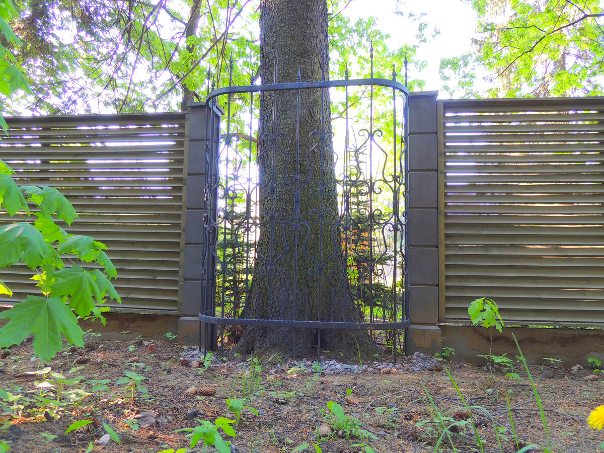 Если забор железобетонный ствол дерева располагается посредине линии ограждения, то дерево может стать своего рода столбом. Но всё же его не стоит замуровывать! В любом случае придётся смириться с разрывом фундамента и заказывать художественную ковку металла под изгиб и обход дерева.