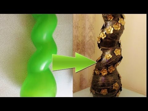 Здравствуйте, дорогие читатели!Посмотрите новый мастер класс, как я решила сделать из длинного шарика и гипсового бинта напольную вазу на мой взгляд получилось очень даже оригинально. Для работы вам понадобиться; 1.Длинный спиралевидный шарик. 2.Крем для рук 3.Гипсовый бинт 4. Строительная шпаклевка,строительный скотч 5.Клей ПВА 6.Капроновая нить 7.Холодный фарфор 8.Акриловые краски,акриловый лак 9.Наждачная бумага,кисти Думаю такой вазы точно не будет ни у кого. И так начнем.Для начала берем воздушный спиралевидный шарик,накачиваем его с помощью ручного насоса для шаров. Затем берем любой крем для рук и смазываем шарик,чтоб в последствии он проще отклеился от гипсового бинта. Далее из картона вырезаем два круга, при помощи горячего пистолета склеиваем их. Затем крепим их к низу шарика при помощи строительного скотча. Далее берем гипсовый бинт(купить можно в аптеке) режем на полоски. Нарезанные полоски по очередности обмакиваем в воду и обклеиваем весь шарик гипсовым бинтом