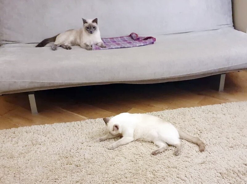 Дааа, традиционные игры наших котов великолепны в своей исключительной непредсказуемости и невозможности предугадать, в какой конкретно момент игры наш котик Митя решит, что наигрался :))) Я совсем недавно размещала уже игры котов "на троих" и внезапное исчезновение Мити с поля игрищ (ссылка). Сегодня этот табун скакал по дому в урезанном составе: Тиша в это время спал, набираясь сил перед вечерними забегами. Митя долго и настойчиво вызывал на бой спящего кота Стёпу, который явно не хотел просыпаться... Митя бегал туда-сюда мимо Стёпы, запрыгивал к нему на лежанку, дергал за хвост. Стёпа долго не хотел сдаваться и вставать, но в итоге решился все-таки поиграть с племянником. Причем в процессе игры и сам разыгрался и явно готов был играть еще и еще... Но с Митей играть - это та еще "рулетка" :)))
