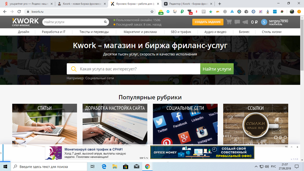 Kwork - это популярный сервис для фрилансеров, для покупки или продажи ваших услуг. Сервис удобен тем что вы можете быстро найти исполнителя, а исполнителям сервис поможет зарабатывать. Перейти в Kwork Категории услуг на бирже Kwork: 1. Дизайн 2. Разработка и IT 3. Тексты и переводы 4. Маркетинг и реклама 5. SEO и трафик 6. Аудио и видео 7. Бизнес 8. Стиль жизни. Сколько можно заработать в Kwork? Всё зависит от вас, сколько вы сможете выполнять заказов, и от ваших расценок. Минимальная стоимость заказа начинается от 500 руб. ниже не бывает. В месяц в может выходить не плохая сумма если вы будете выполнять заказы. Самые популярные заказы выполняют фрилансеры это обычно на доработки каких нибудь сайтов, на логотипах, сайты под ключ, перевод текста. Перейти на Кворк На чём можно заработать? На Кворке можно заработать новичку, даже если вы не владеете IT-професс