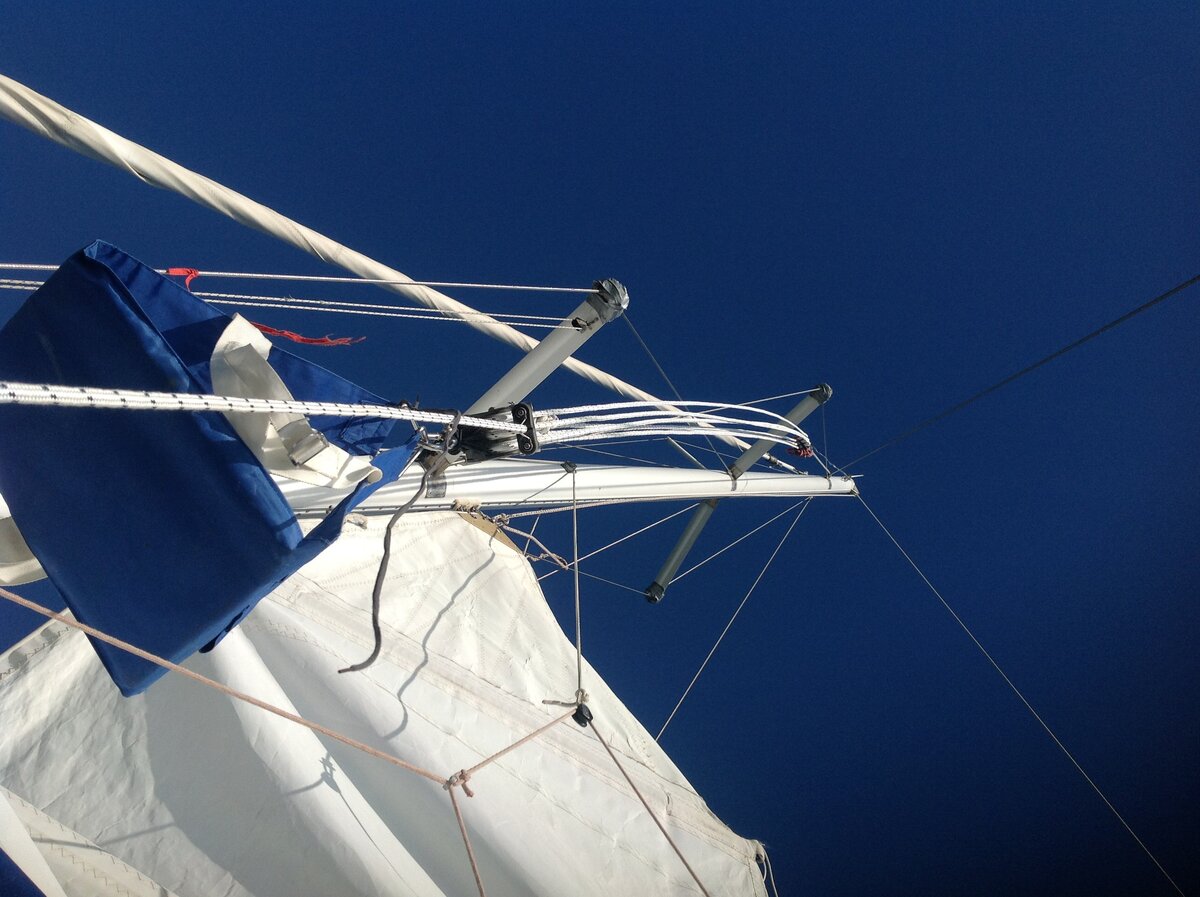 Блин, снова аутсайд, в угол, к пляжу. Одному на мачту лезть стремно, но что делать? Снял с гика оба тройных блока, заменил гроташкот длинным линем из канатного ящика. 25 м, а все равно маловато, чтоб сесть в беседку пришлось забираться на гик. Затянул полиспас на топ мачты, прицепил беседку, стал поднимать себя вверх. Черт возьми, страховки нет, рука соскользнет - и ага.