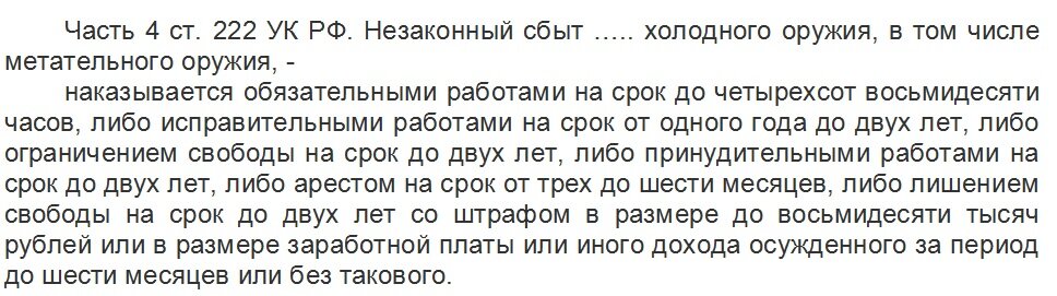 Дабы не вдаваться в бесконечные детали отметим по сбыту главное - чтобы обезопасить себя при покупке и продаже холодного оружия или предметов с ним сходных надо следить за тремя вещами: