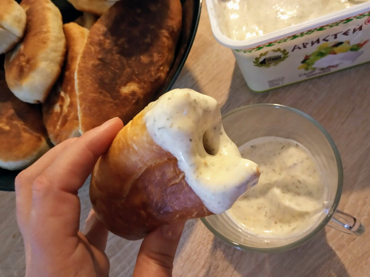 Консистенция тоже удобная, не жидкая, соус лёгкий на вкус. Я люблю его с пирожками особенно! Готовится он быстро. Я использую контейнер или, как в данном случае, коробочку от сыра фета 500 г. Получается примерно 480 мл соуса. Итак, смешиваю кефир жирностью 2,5 % с майонезным соусом жирностью 30%. Это база. Соотношение такое - кефир 2 части, майонез 1 часть. База получится не очень солёной и яркой по вкусу поэтому вот мои дополнения: 1 ч. л. горчицы, пачка сушёного чеснока(10 г), маленькая щепотка соли и пол ч. л. сушёного укропа. Я использую именно сушёный чеснок. Когда он настаивается в соусе, он как бы разбухает и очень приятно чувствуется потом в нём. Такие однородные, слегка даже похрустывающие частички, очень прикольно! Соус отлично хранится в холодильнике. Срок годности кефира -2 недели, майонеза - вообще долго) Главное, купить свежий кефир. Ну а вот мои пирожки с горохом. Готовить их просто, получаются очень вкусные и дешёвые, а ещё они полностью постные. Если интересен рецепт -