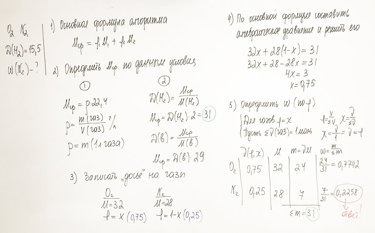 Плотность по водороду смеси кислорода и азота составляет 15,5. Вычислите объемные доли газов и массовую долю азота