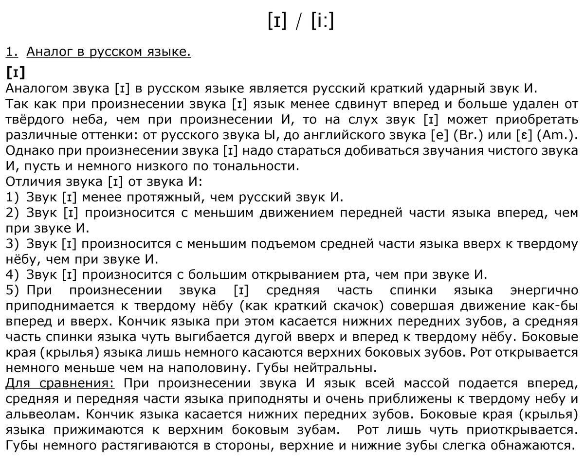 [ɪ] - с большим открытием рта, чем при И, язык не так сильно сдвинут вперед, как при И, и губы не растянуты, как при И [i:] - с меньшим подъемом средней части языка к твердому нёбу, чем при И, язык чуть меньше сдвинут вперед, чем при И, и у звука "переменный" язык, то есть изменяется положение языка во время произнесения звука (дальнейшее продвижение языка к нёбу вперед и чуть вверх) Полезные ссылки Послушать и воочию увидеть произношение звуков [ ɪ ] и [ i: ] в американском английском языке, рассмотреть положение и работу органов речи, потренироваться в произношении, и узнать побольше о произнесении звуков [ ɪ ] и [ i: ] Вы сможете пройдя по ссылке: https://rachelsenglish.com/english-pronounce-ih-vowel/ https://rachelsenglish.com/english-pronounce-ee-vowel/ Веб-сайт проекта Rachel's English: rachelsenglish.com принадлежит, пожалуй, самому лучшему преподавателю фонетики американского варианта английского языка - Рэйчел. Вы найдете не только видео-уроки: American Englis