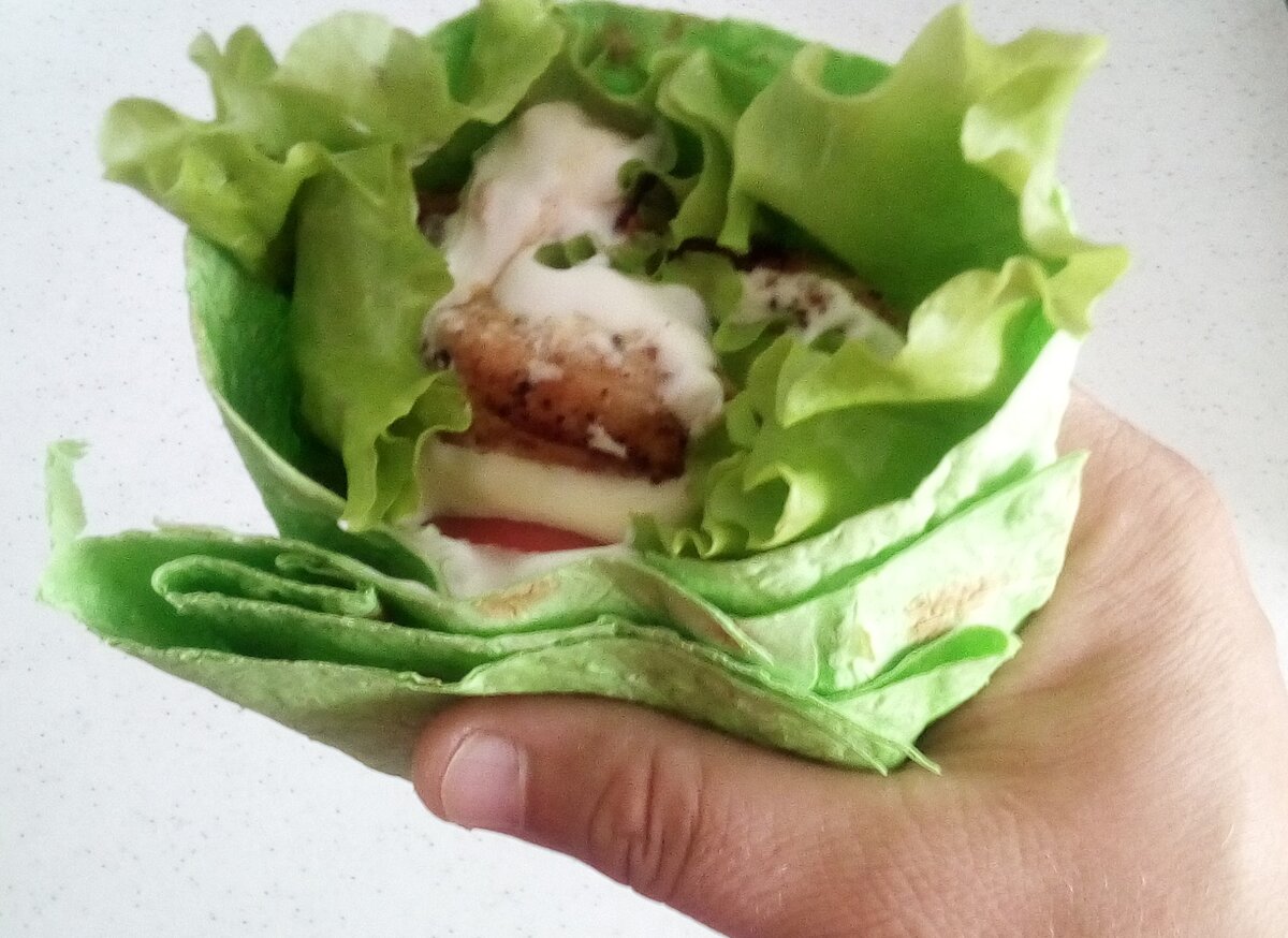 6. Как только хаш подрумянился,выкладываем его на лаваш поверх сыра и смазываем соусом , ломтик сыра,на который выложим нашу готовую и поджаристую грудку и опять ломтик сыра,колечко помидора и соус.Теперь аккуратно заворачиваем лаваш,начиная с краев,а потом и снизу,при этом хорошо стянув его,но не переусердствуй,а то порвется.