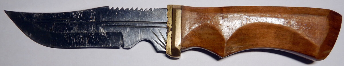 Всем здравствуйте! Изготовление ножа дело, конечно же, непростое, и сейчас мы говорим даже не о технической стороне процесса, а именно о конструктивной творческой составляющей. Получится ли бесполезная, ни на что не годная железка, валяющаяся в гараже, или хороший нож, который будет служить верно и долго, вот наверное самая сложная задача для мастера. Иногда и нож вроде сделан хорошо – и материалы и качество обработки на высоте, но так неудачно, что пользоваться им совершенно невозможно. Сегодня у нас нескладной нож кустарного производства, происхождение ножа неизвестно (владелец откопал его в залежах старого хлама на антресолях при переезде).