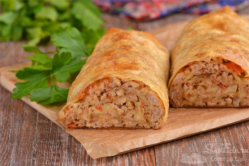 Сытный, сочный и потрясающе вкусный рулет из лаваша с фаршем и сыром в духовке. Для начинки беру мясной фарш, лук, помидор и твердый сыр. Из простых ингредиентов получается праздничное блюдо, которое можно подать как основное с гарниром или как горячую закуску. Просто в приготовлении, сытно и очень-очень ароматно!!! Порции 5 Время подготовки 30 минут Время приготовления 20 минут Ингредиенты Инструкции 1. Репчатый лук нарезаем не очень мелко, помидор – на небольшие кубики. В сковороду в масло отправляем мясной фарш и подготовленные овощи. Хорошо все перемешиваем, накрываем и готовим, периодически помешивая, на среднем огне около 15 минут, пока овощи не станут мягкими и не испарится жидкость. Можно использовать фарш из любого мяса, у меня домашний фарш из свинины и курицы. 2. Готовый фарш посыпаем солью, молотым перцем, перемешиваем, убираем с плиты и остужаем. 3. Чтобы рулет получился с ровными краями, из лаваша вырезаем прямоугольник. 4. Подготовленную мясную нач