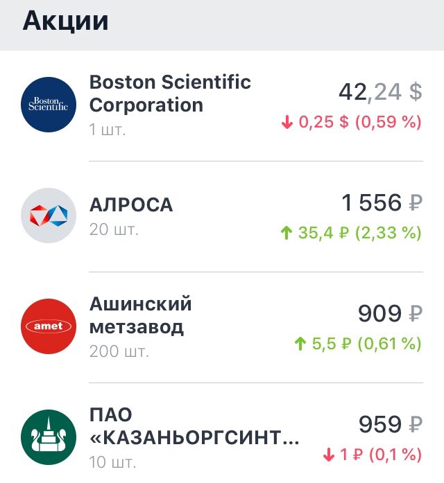 Всем доброго времени суток! Boston слез с горок и пошёл наконец вверх и преодолел цену покупки, но, с учётом курсовой разницы, все равно не вышел в плюс:( Новая акция АЛРОСА в первый день решила удивить, рост за день 2%, очень хорошо. Ашинский завод так-же растёт, осталось 2р и будет нужная цена, наконец продам. Новая акция КАЗАНЬОРГСИНТЕЗ Единственный кто не подрос и даже немного подешевел. Акция удивила движением, своеобразное, не как у других. Казначейские облигации за день вышли в ноль, бывает🤷🏻♂️ Все активы Доходность Доход 5,06₽ или 0,03% Движение котировок за день Всем спасибо! ПОДПИСАТЬСЯ НА КАНАЛ Очень буду рад лайку и комментарию. Обязательно делитесь вашим мнением! Ваша поддержка самое важное. Есть вопросы? пишите на->почтаили в комментарии Есть интересная история инвестирования?напиши->почта