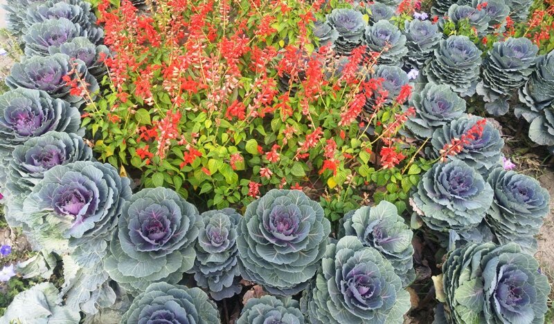 Капуста может быть красивой, есть множество декоративных сортов и разновидностей капусты, их используют для украшения клумб совместно с другими цветами. Наиболее красивый вид декоративная капуста приобретает в конце августа – в сентябре, когда большинство других цветов уже угасли. Чем холоднее становится, тем ярче и пышнее «расцветает» капуста на клумбе. Это растение может выдержать сильные заморозки до -8…-10 градусов, поэтому растение остаётся практически единственным украшением участка до зимы. Декоративную капусту можно разделить на два типа: - листовая капуста с высоким стеблем, на котором располагаются изогнутые вниз листья и в целом растение похоже на пальму. Листья капусты могут быть зелёные, бардовые и других окрасок, с кучерявой, разрезной или гофрированной формой. - ко второй группе относятся сорта с классической рыхлой розеткой листьев, на укороченном стебле. К осени внутренние листья розетки приобретают другую окраску – розовую, жёлтую, белую. Листья капусты могут иметь