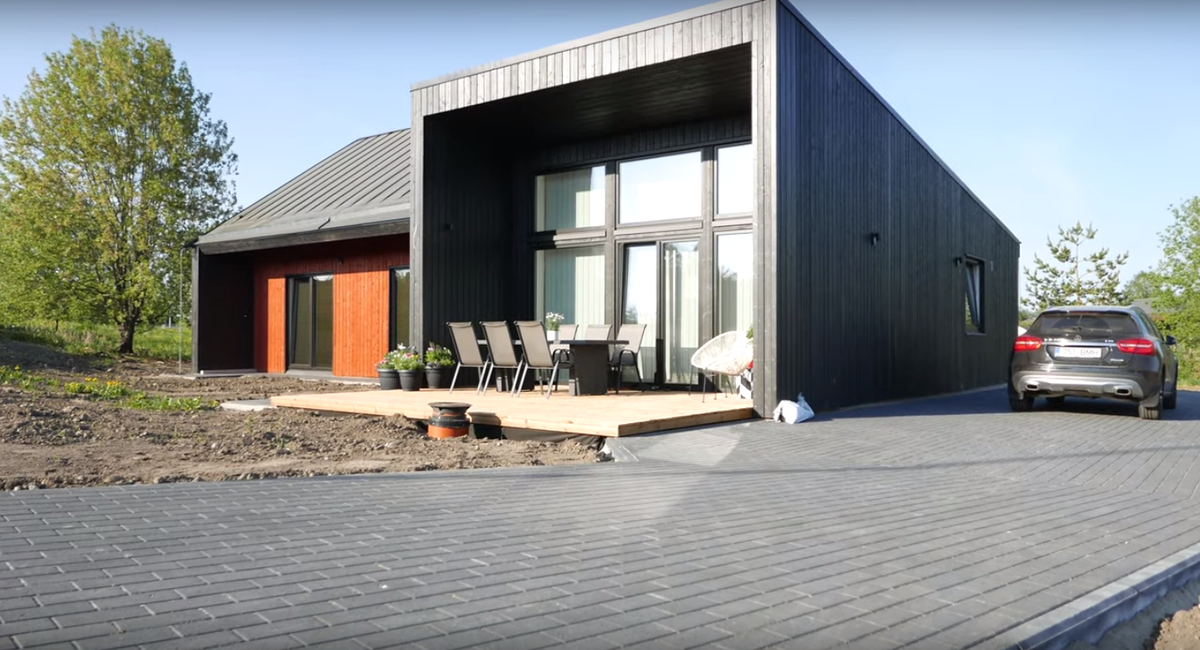 Дом имеет свой особый характер и необычную форму. Он очень классно смотрится за счет черно-оранжевых фасадов, за счет необычной формы крыши и за счет большой площади остекления в гостиной. Дом недавно построен и на момент съемки ландшафт еще не был закончен. Вообще, со стороны кажется ,что это два дома и когда я приехал на место я уточнил у хозяина точно ли это дом на одну семью или это дом на две семьи, но нет это дом именно на одну семью. Дом в плане сделан как бы форме буквы Г и состоит из двух модулей первый модуль это тамбур, гостиная и кухня и внутренние габариты этого модуля 5.4 на 8.6 метров ,а второй модуль со спальнями имеет внутренние габариты 10.1 на 8.3 общая площадь помещений 119 метров квадратных.