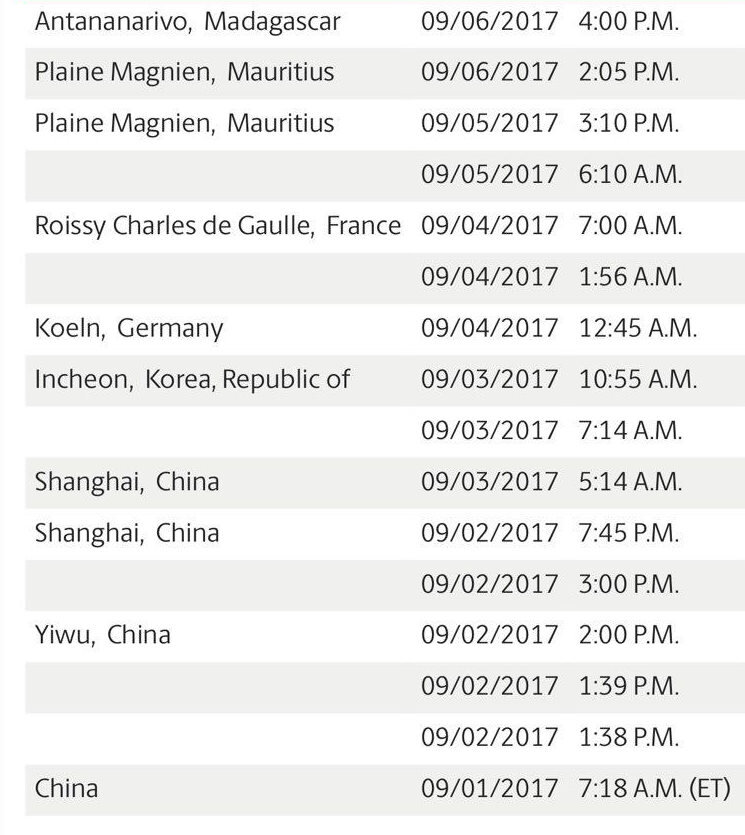 Иу (Китай) - Шанхай (Китай) - Инчхон (Корея) - Кёльн (Германия) - Париж (Франция) - Маврикий - Антананариву (Мадагаскар). И все в течении недели, хотя из Гонгконга есть прямой рейс.