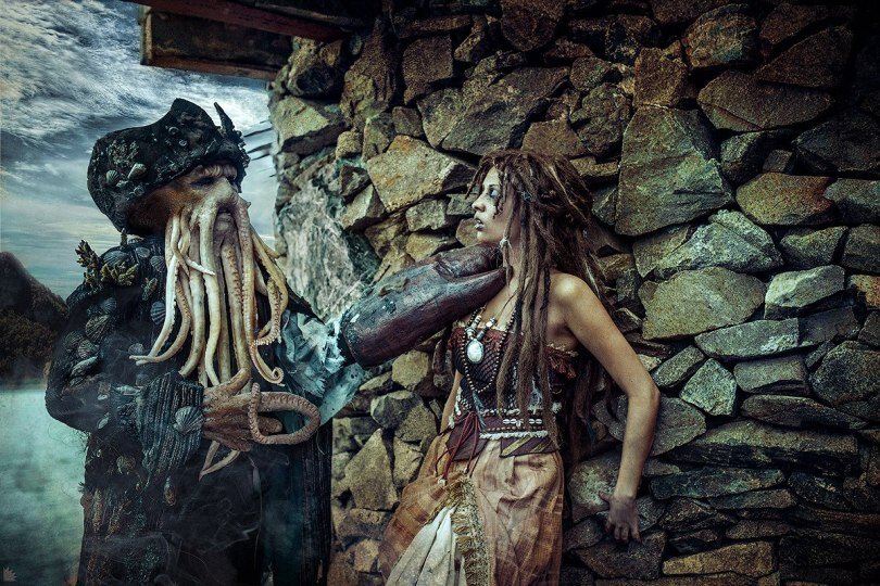 Есть любительский косплей, есть косплей профессиональный, а есть идеальное сочетание исполнения грима и костюма, воплощения персонажа, съемки и обработки фото. Этот косплей фотосет Дейви Джонса и его возлюбленной богини Калипсо из фильмов Пираты Карибского моря навсегда запомнится вам благодаря своему высокому уровню.